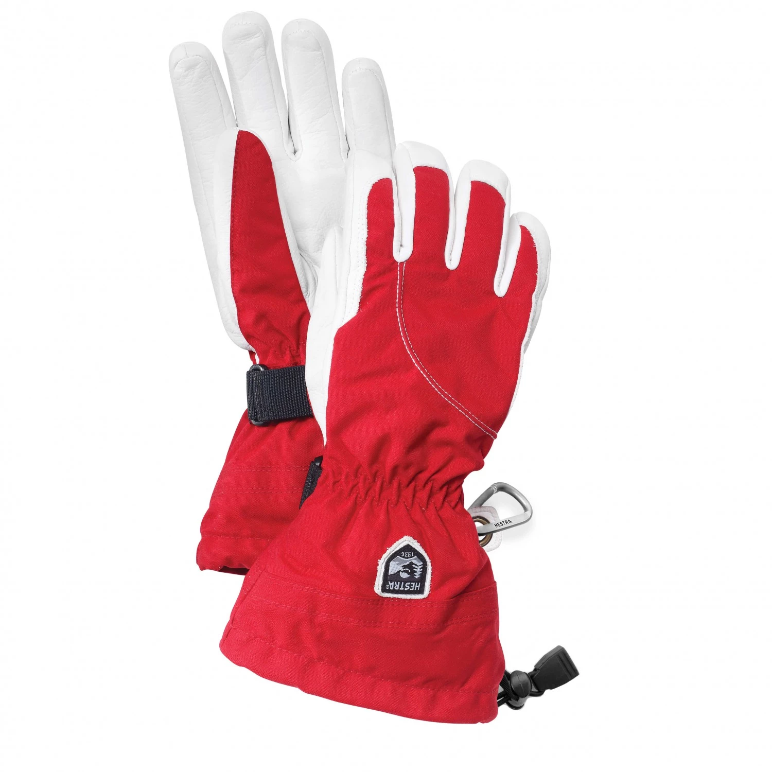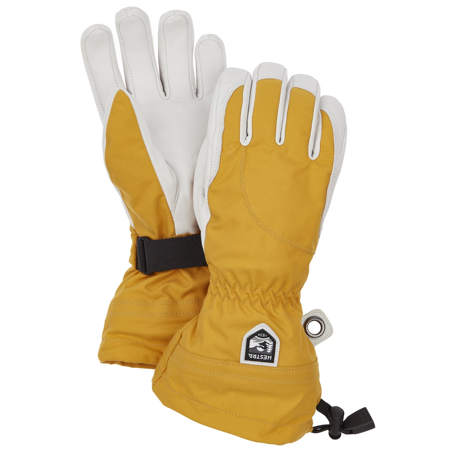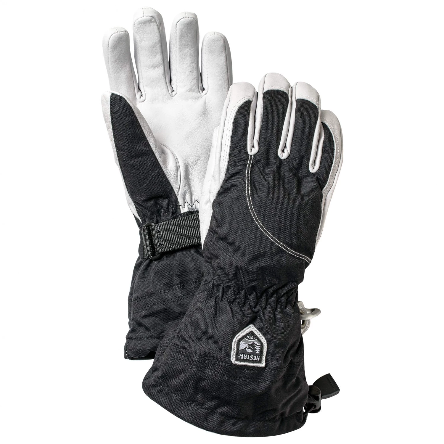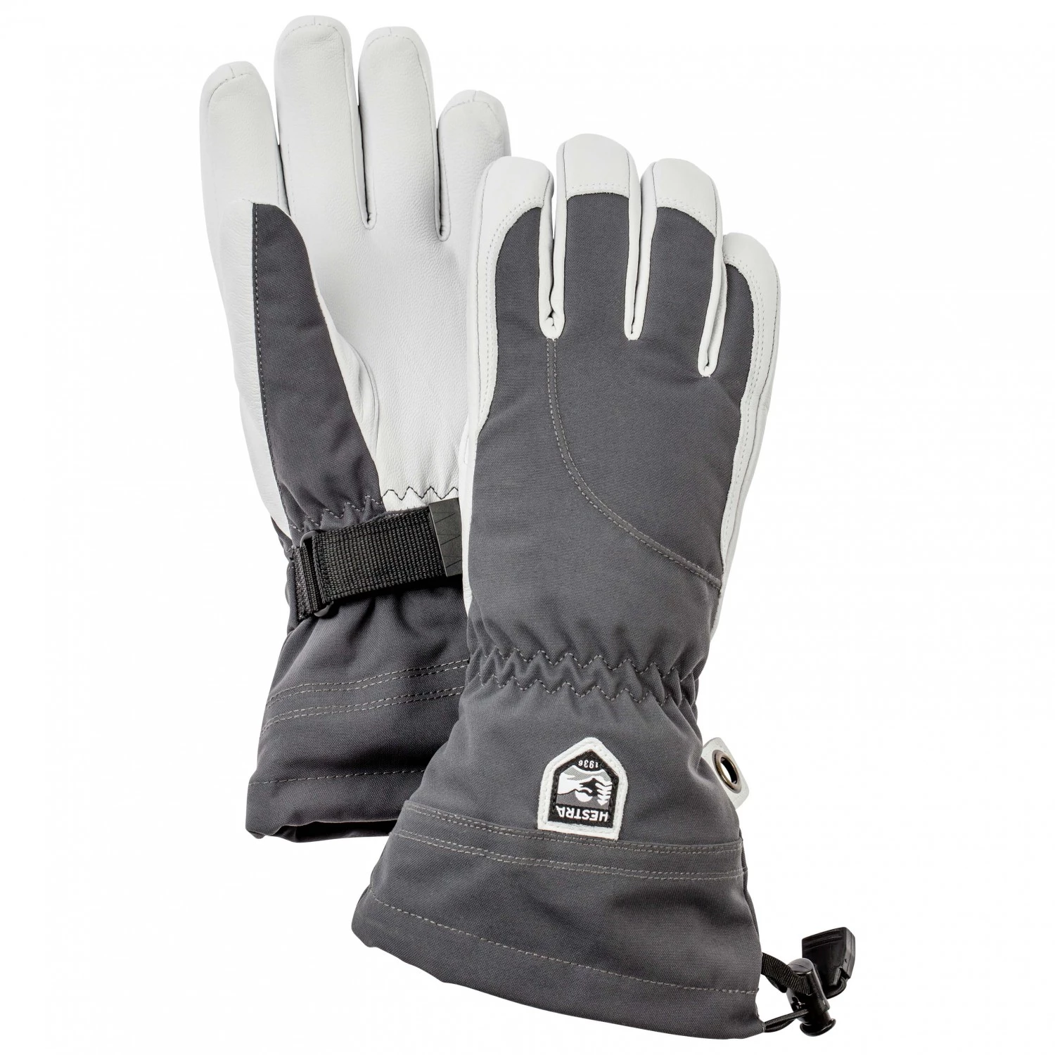 Le dos du gant extérieur est en polyamide Triton robuste et respirant et la paume en cuir de chèvre Army. Ce cuir imperméabilisé se caractérise par ses qualités extrêmement hydrofuges et résistantes. Les gants intérieurs sont composés de G-Loft, une isolation synthétique qui procure une bonne isolation thermique. On peut bien sûr ôter les gants intérieurs pour les sécher, les nettoyer,… Les larges manchettes avec cordons de serrage et sangles font le lien avec les manches pour que l’air froid et la neige ne puissent pas s’infiltrer. Les boucles de sécurité qu’on trouve sur presque tous les gants de Hestra sont également très pratiques, puisqu’elles permettent d’accrocher les gants pour ne pas les perdre.